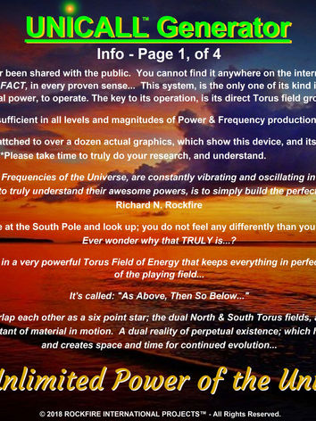 The UNICALL™ Energy System is the world's first power grid of its kind. It was created by Sir Richard Rockfire, as a Safe, All Natural, Unlimited, Power Source. It utilizes Cymatic Technology, coupled with Powerful Magnets & Crystals, to generate massive Energy & RF Frequency range. It is completely Self Sufficient, and never stops producing Power. The device itself is NOT a "FREE ENERGY" generator that creates something out of nothing. It simply uses Frequency, Sound, and Oscillating Currents that are combined with EMF & Cymatic Control to Harness & Amplify what is already there!
